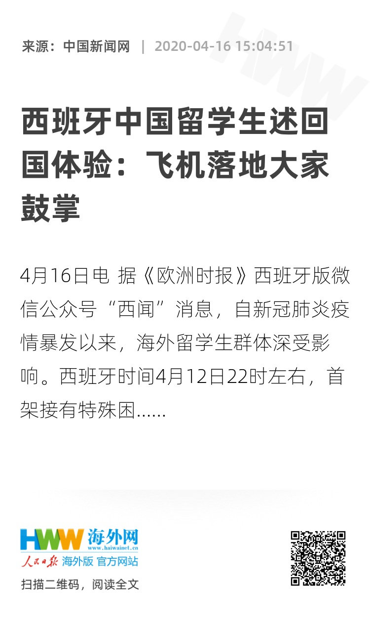 中新网4月16日电 据《欧洲时报》西班牙版微信公众号“西闻”消息,自新冠肺炎疫情暴发以来,海外留学生群体深受影响。西班牙时间4月12日22时左右,首架接有特殊困难的在西班牙的中国留学生的商业包机从马德里起飞,带着170余名留学生回家。