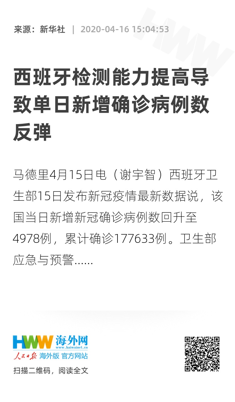 新华社马德里4月15日电(谢宇智)西班牙卫生部15日发布新冠疫情最新数据说,该国当日新增新冠确诊病例数回升至4978例,累计确诊177633例。卫生部应急与预警协调中心主任费尔南多·西蒙说,日增病例数出现反弹主要是检测能力提高所致。