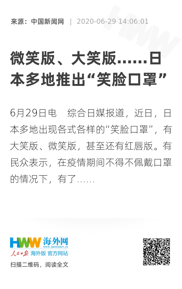 中新网6月29日电 综合日媒报道,近日,日本多地出现各式各样的“笑脸口罩”,有大笑版、微笑版,甚至还有红唇版。有民众表示,在疫情期间不得不佩戴口罩的情况下,有了这些“笑脸口罩”,可以在防疫的同时将微笑带给众人,非常实用。