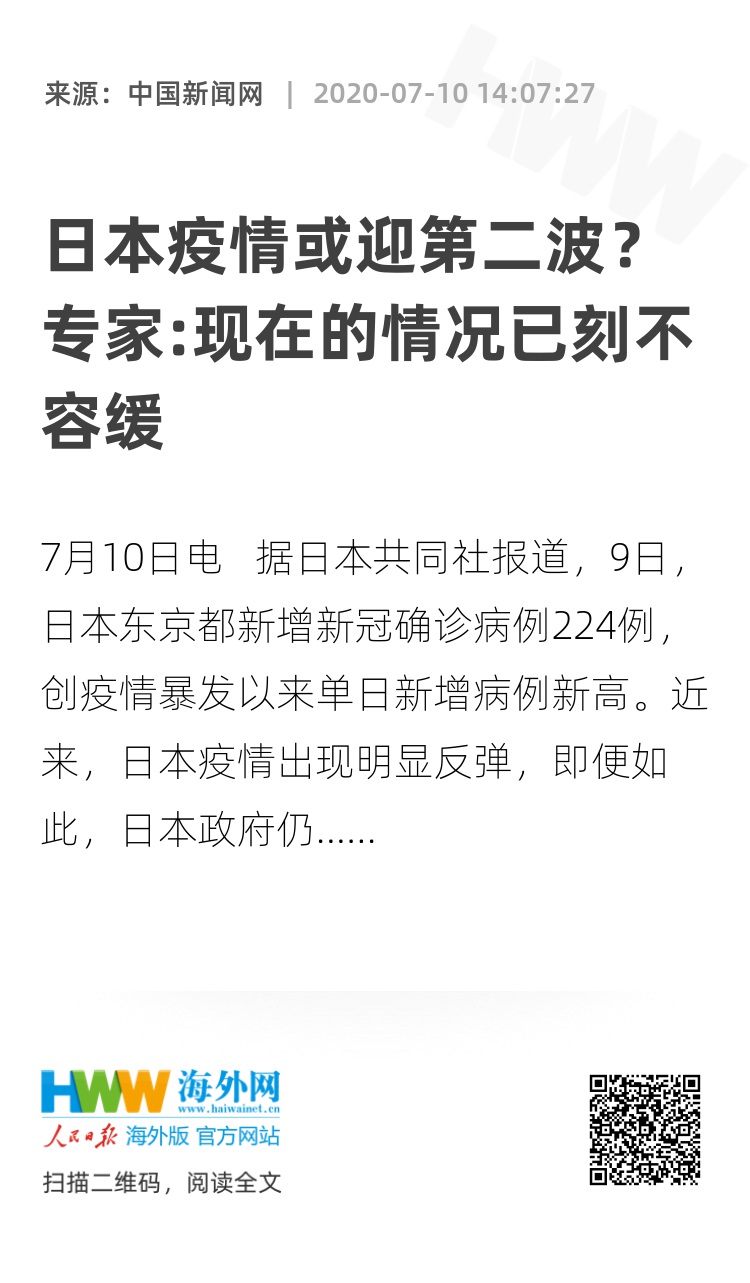 中新网7月10日电 据日本共同社报道,9日,日本东京都新增新冠确诊病例224例,创疫情暴发以来单日新增病例新高。近来,日本疫情出现明显反弹,即便如此,日本政府仍维持从10日起放宽大型活动举办限制的方针,对再次发布紧急事态宣言也持否定态度。不过,医护一线一些声音认为,“情况已经称得上是第二波”,专家也对当局的态度表示质疑,呼吁其采取具体措施,以防止疫情扩大。