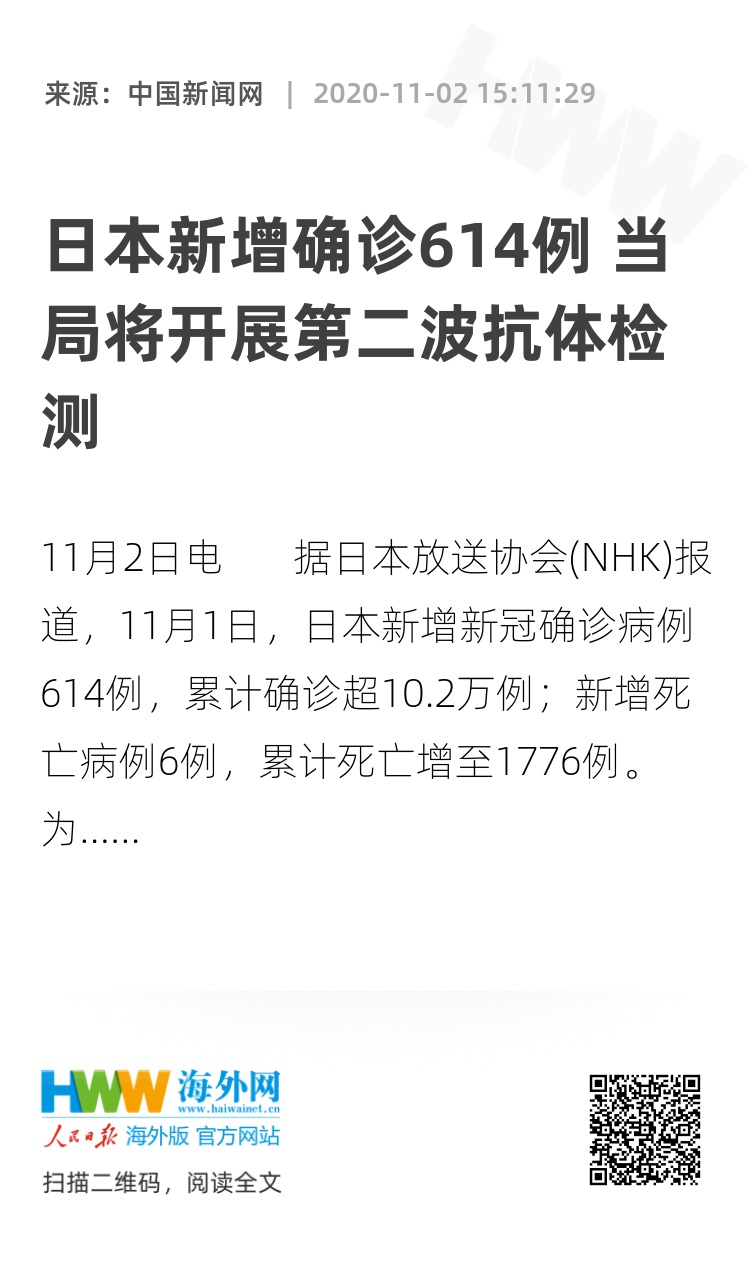 中新网11月2日电 据日本放送协会(NHK)报道,11月1日,日本新增新冠确诊病例614例,累计确诊超10.2万例;新增死亡病例6例,累计死亡增至1776例。为摸清夏季以来疫情蔓延的大体情况,当局将开展万人规模的新冠抗体检测。