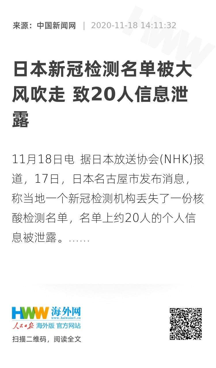 中新网11月18日电 据日本放送协会(NHK)报道,17日,日本名古屋市发布消息,称当地一个新冠检测机构丢失了一份核酸检测名单,名单上约20人的个人信息被泄露。