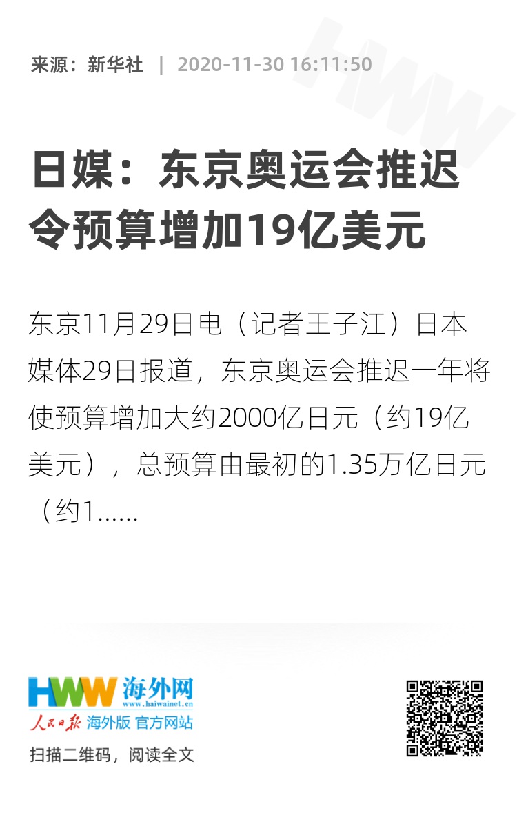 新华社东京11月29日电(记者王子江)日本媒体29日报道,东京奥运会推迟一年将使预算增加大约2000亿日元(约19亿美元),总预算由最初的1.35万亿日元(约130亿美元)增加到1.55万亿日元(约149亿美元),增幅约为15%。