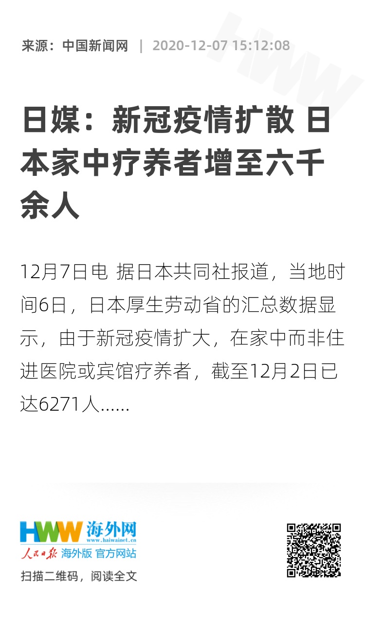 中新网12月7日电 据日本共同社报道,当地时间6日,日本厚生劳动省的汇总数据显示,由于新冠疫情扩大,在家中而非住进医院或宾馆疗养者,截至12月2日已达6271人,与1周之前的11月25日相比,全国增加了1281人。而1个月之前,这一数字仅为1096人。