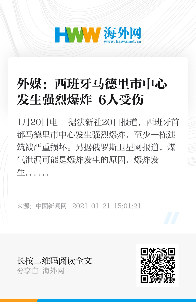 中新网1月20日电 据法新社20日报道,西班牙首都马德里市中心发生强烈爆炸,至少一栋建筑被严重损坏。