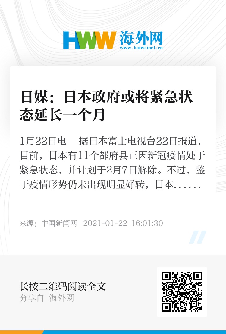 据报道,虽然日本政府已分别于1月8日和1月13日,宣布首都圈的1都3县和关西等地的7府县进入紧急状态。但约两周时间过去,日本的疫情未出现明显好转。