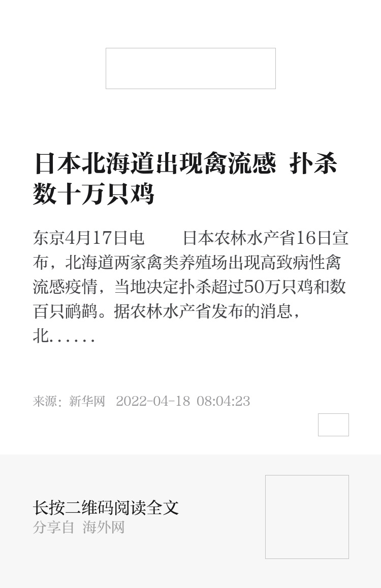 新华社东京4月17日电 日本农林水产省16日宣布,北海道两家禽类养殖场出现高致病性禽流感疫情,当地决定扑杀超过50万只鸡和数百只鸸鹋。
