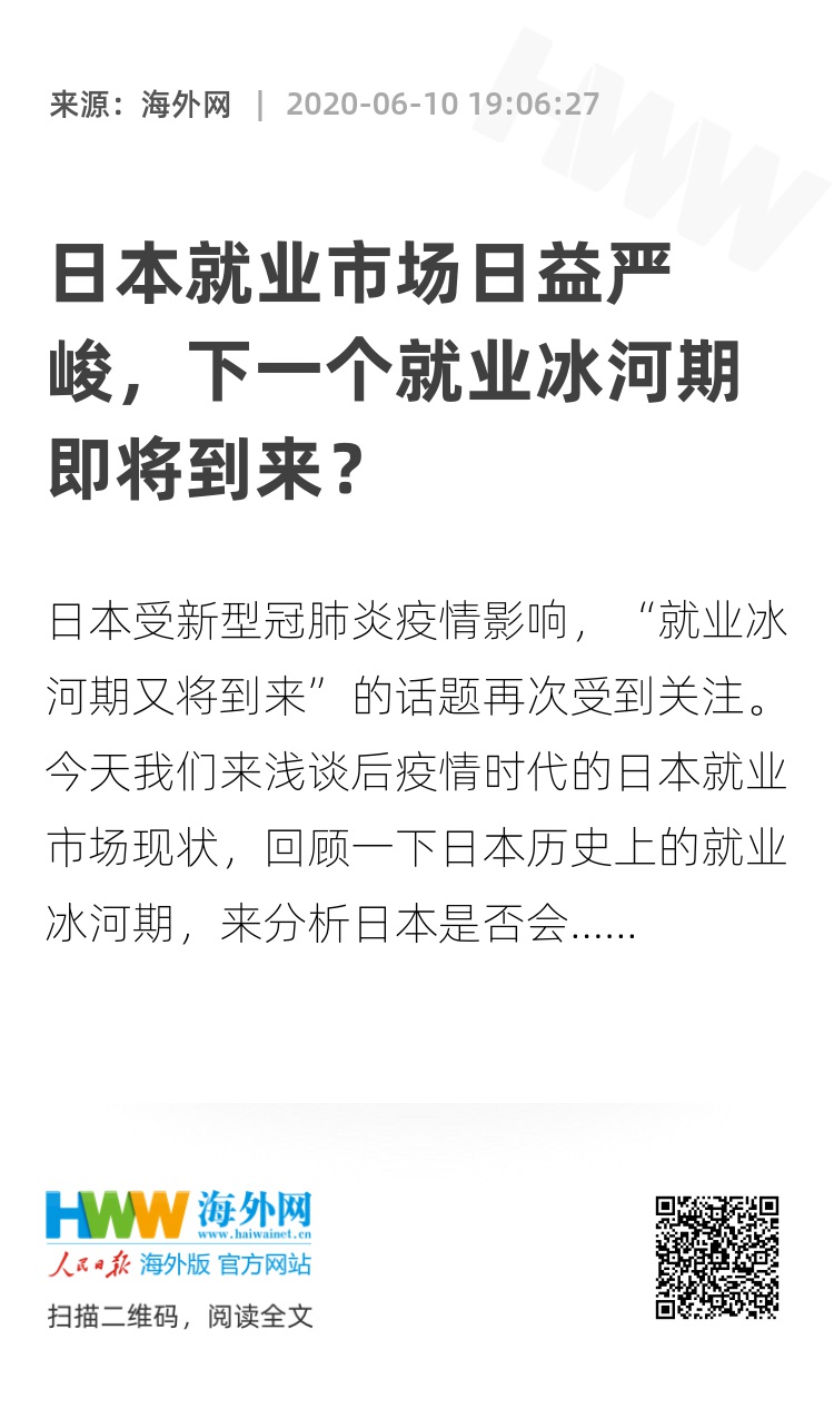 海外网6月10日电 日本受新型冠肺炎疫情影响,“就业冰河期又将到来”的话题再次受到关注。今天我们来浅谈后疫情时代的日本就业市场现状,回顾一下日本历史上的就业冰河期,来分析日本是否会迎来下一个就业冰河期。