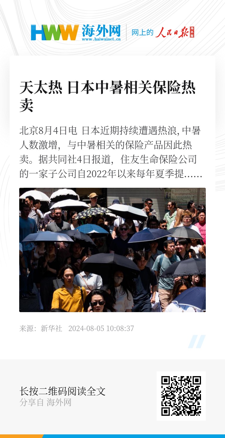 据共同社4日报道,住友生命保险公司的一家子公司自2022年以来每年夏季提供中暑保险服务。截至7月25日,该公司今年已与客户签订超过10万份与中暑相关的保险合同,其中自7月16日起10天内签订的该合同约有3万份。