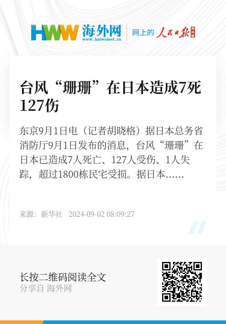 新华社东京9月1日电(记者胡晓格)据日本总务省消防厅9月1日发布的消息,台风“珊珊”在日本已造成7人死亡、127人受伤、1人失踪,超过1800栋民宅受损。
