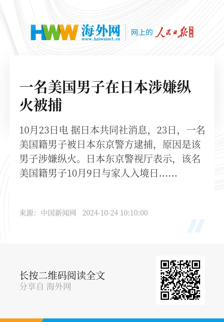 中新网10月23日电 据日本共同社消息,23日,一名美国籍男子被日本东京警方逮捕,原因是该男子涉嫌纵火。