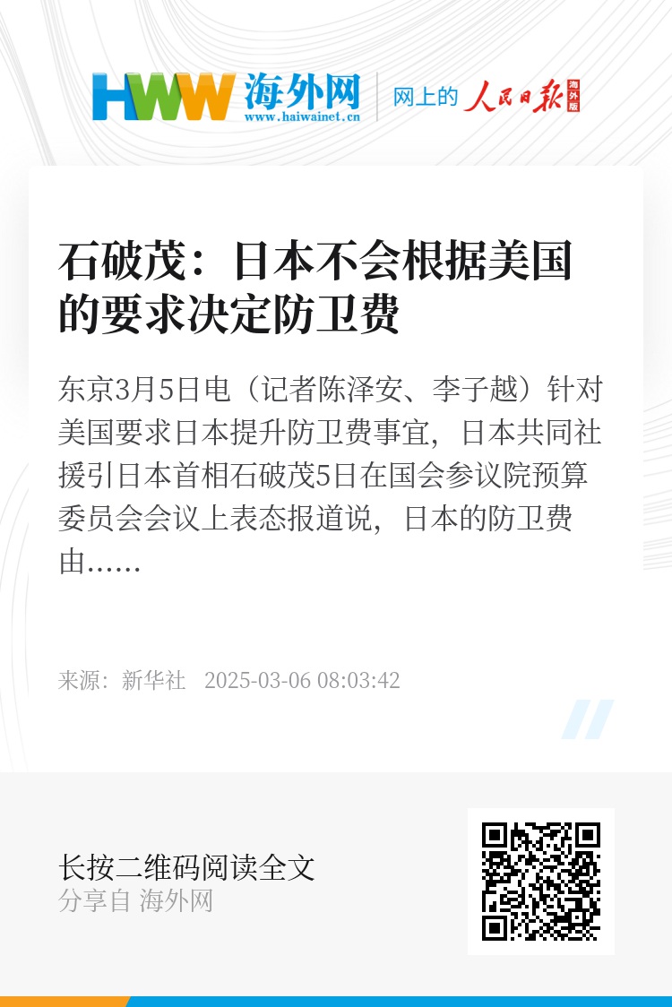新华社东京3月5日电(记者陈泽安、李子越)针对美国要求日本提升防卫费事宜,日本共同社援引日本首相石破茂5日在国会参议院预算委员会会议上表态报道说,日本的防卫费由日本决定,而不是根据其他国家说了什么来决定。