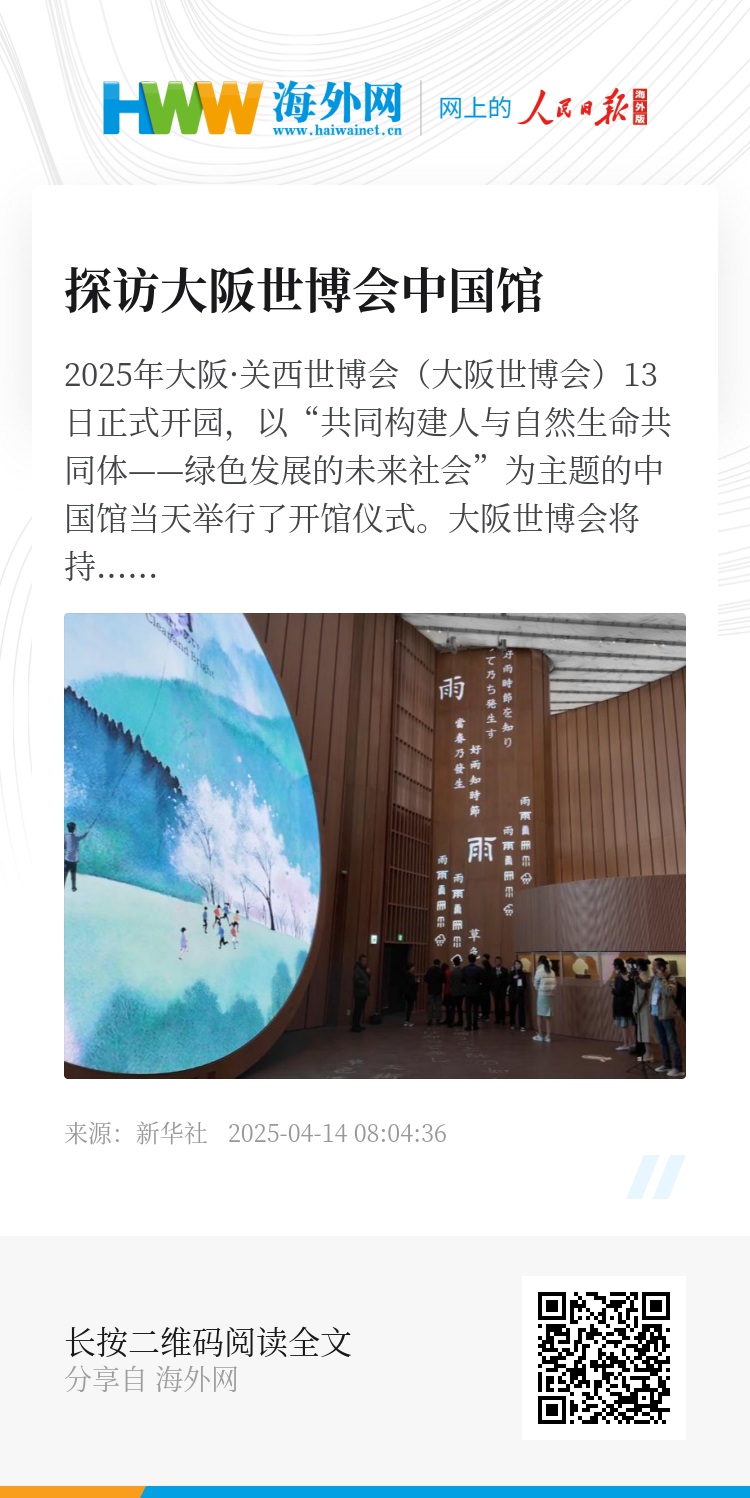 大阪世博会将持续至10月13日。中国馆是本届世博会面积最大的外国自建馆之一,占地面积约3500平方米。