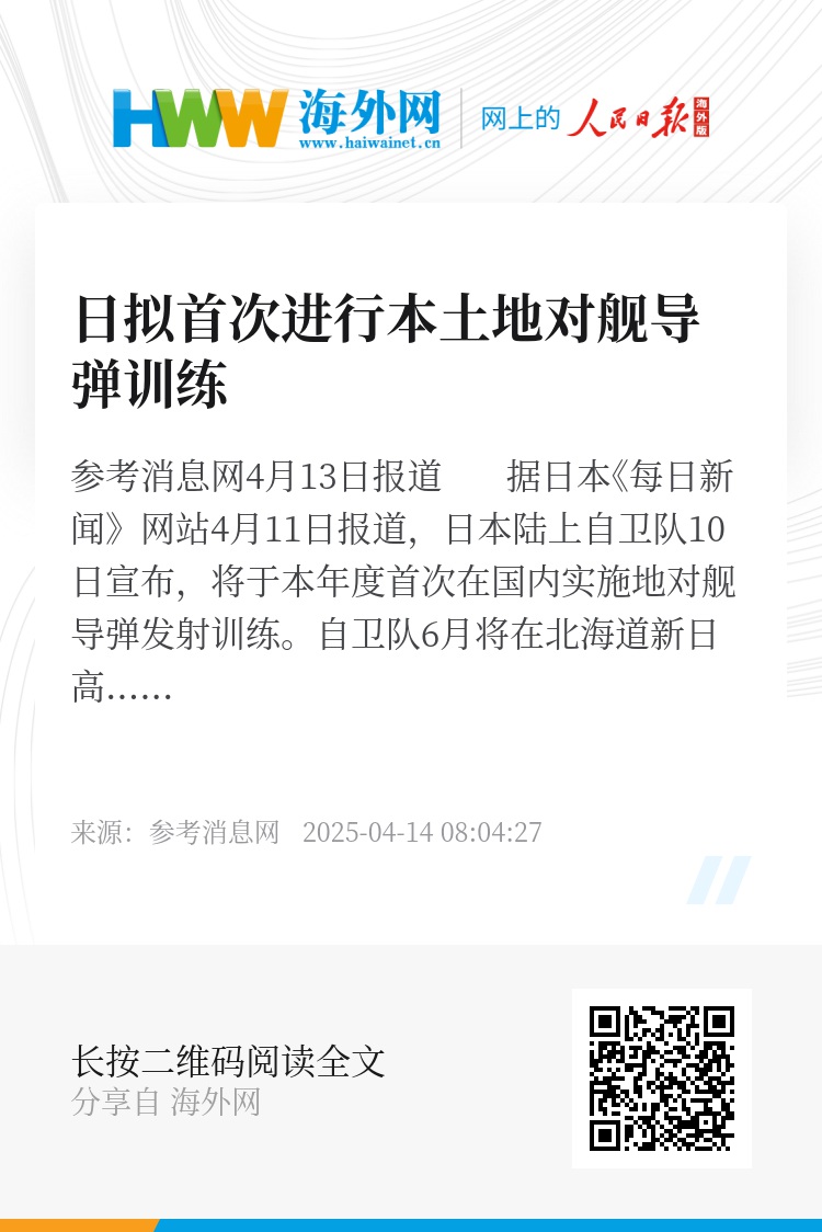参考消息网4月13日报道 据日本《每日新闻》网站4月11日报道,日本陆上自卫队10日宣布,将于本年度首次在国内实施地对舰导弹发射训练。