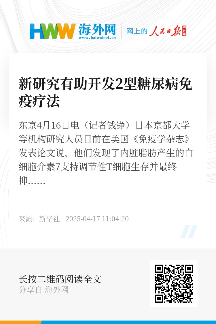 新华社东京4月16日电(记者钱铮)日本京都大学等机构研究人员日前在美国《免疫学杂志》发表论文说,他们发现了内脏脂肪产生的白细胞介素7支持调节性T细胞生存并最终抑制2型糖尿病的机制。这一成果有望为开发2型糖尿病新免疫疗法提供思路。