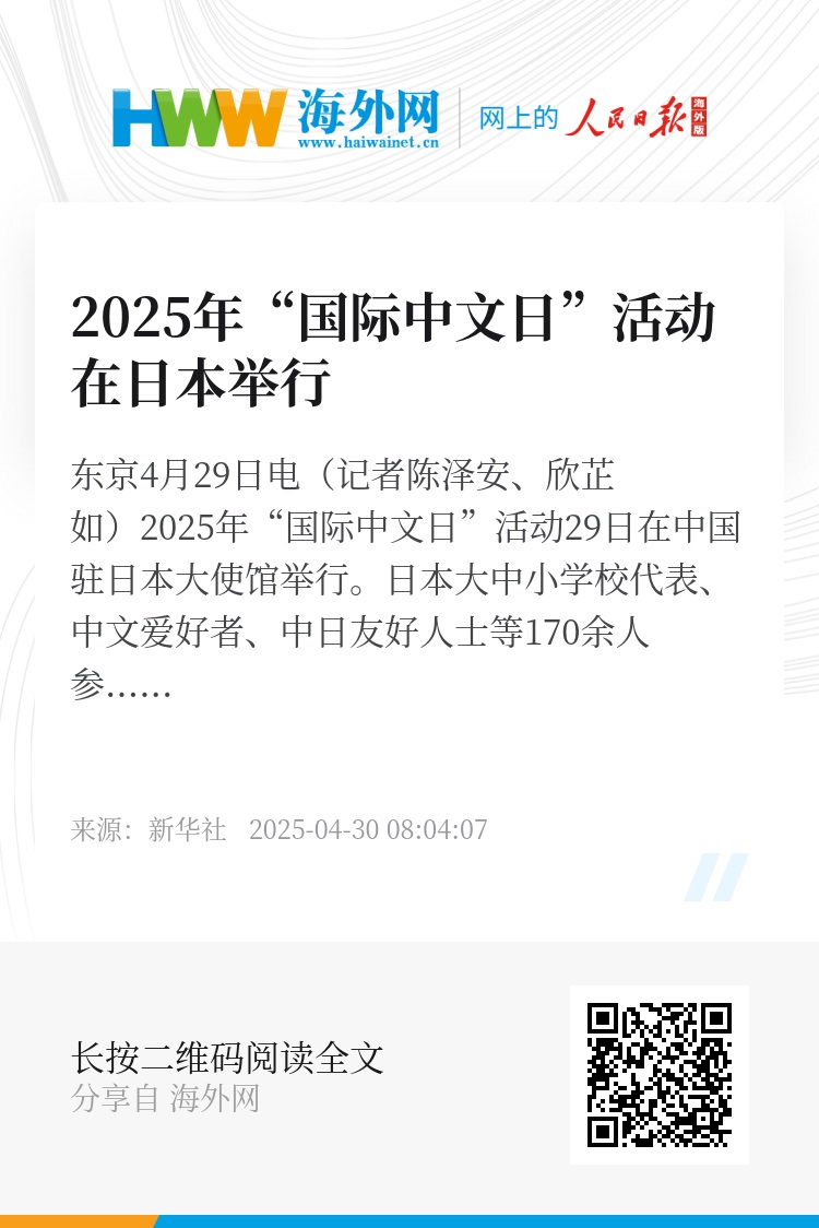 新华社东京4月29日电(记者陈泽安、欣芷如)2025年“国际中文日”活动29日在中国驻日本大使馆举行。日本大中小学校代表、中文爱好者、中日友好人士等170余人参加。
