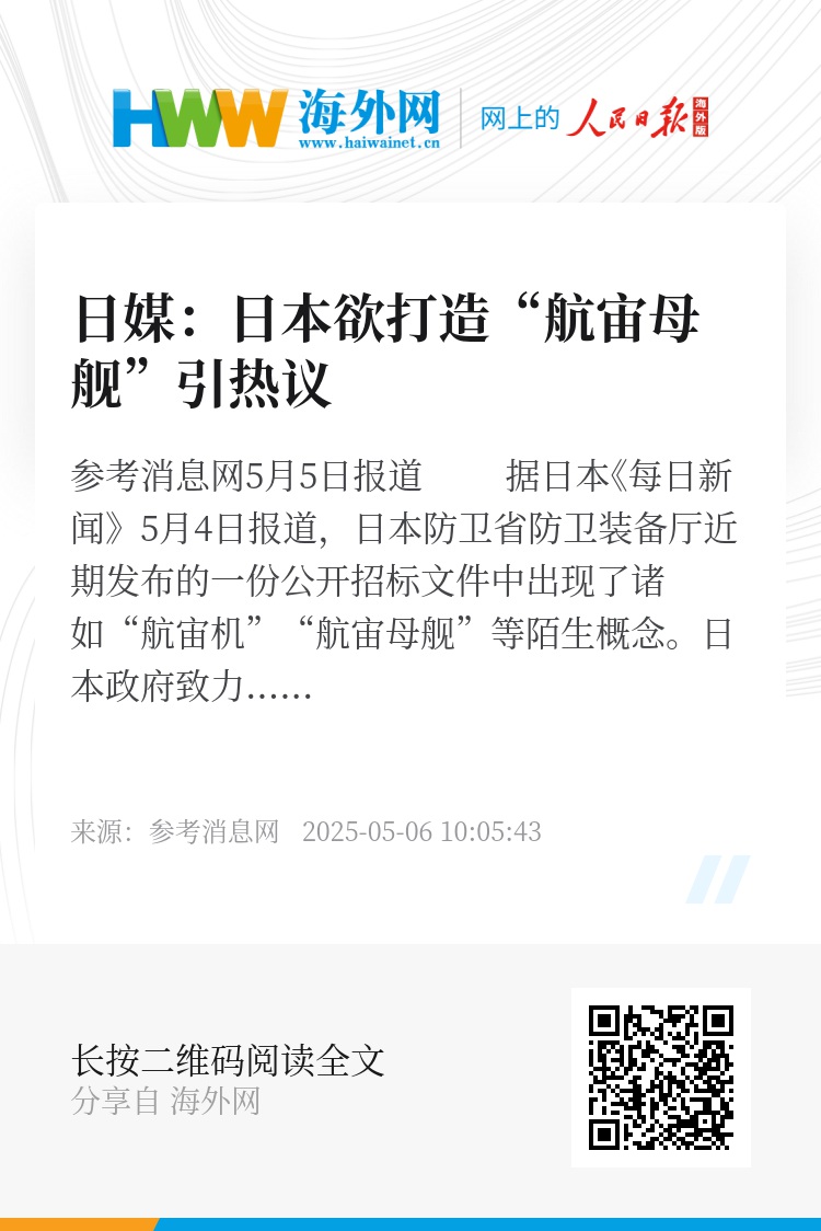参考消息网5月5日报道 据日本《每日新闻》5月4日报道,日本防卫省防卫装备厅近期发布的一份公开招标文件中出现了诸如“航宙机”“航宙母舰”等陌生概念。
