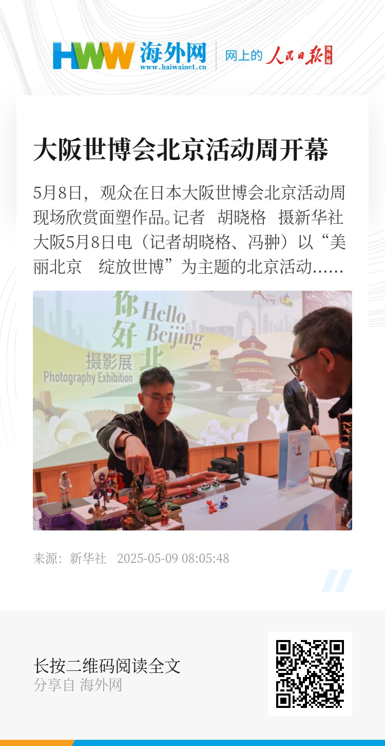 新华社大阪5月8日电(记者胡晓格、冯翀)以“美丽北京 绽放世博”为主题的北京活动周8日在大阪世博会中国馆拉开帷幕。中国驻大阪总领事薛剑、大阪世博会中国馆馆长晏晨晖、日本政府代表、北京市政府和企业界代表等100余人参加开幕式及相关活动。