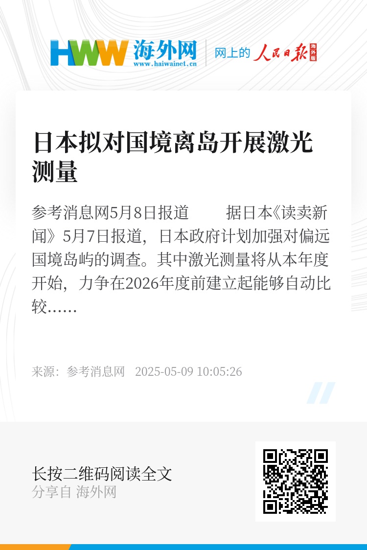 参考消息网5月8日报道 据日本《读卖新闻》5月7日报道,日本政府计划加强对偏远国境岛屿的调查。其中激光测量将从本年度开始,力争在2026年度前建立起能够自动比较地形变化的“地形匹配系统”,尽快掌握受侵蚀等带来的影响,保住现有日本的领海和专属经济区划界范围。