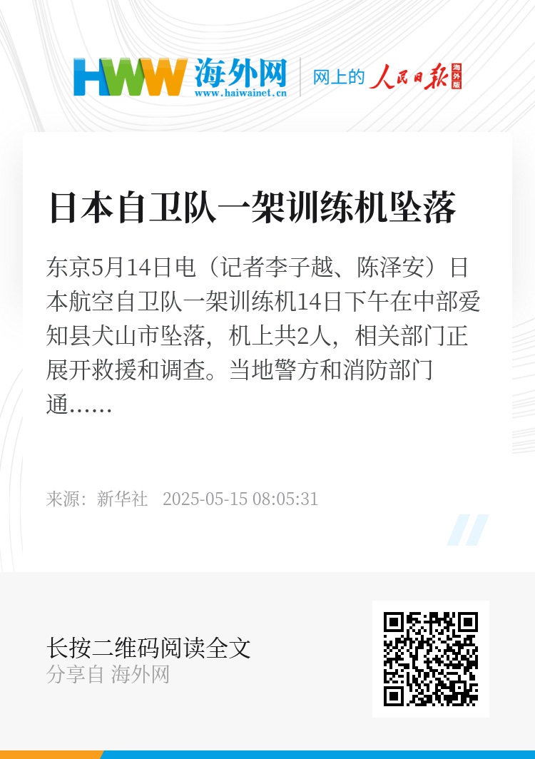 新华社东京5月14日电(记者李子越、陈泽安)日本航空自卫队一架训练机14日下午在中部爱知县犬山市坠落,机上共2人,相关部门正展开救援和调查。