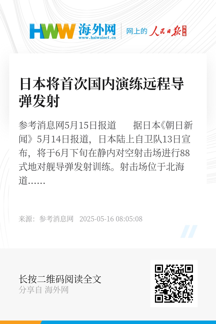 参考消息网5月15日报道 据日本《朝日新闻》5月14日报道,日本陆上自卫队13日宣布,将于6月下旬在静内对空射击场进行88式地对舰导弹发射训练。射击场位于北海道新日高町,导弹可以从陆地攻击海上舰艇。