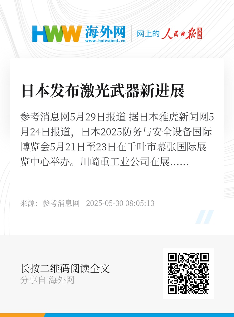 参考消息网5月29日报道 据日本雅虎新闻网5月24日报道,日本2025防务与安全设备国际博览会5月21日至23日在千叶市幕张国际展览中心举办。川崎重工业公司在展会上首次公开舰载高功率激光装置概念。展示视频呈现了搭载于海上自卫队宙斯盾舰与“最上”号护卫舰的100千瓦激光装置,击落高速来袭无人机的场景。