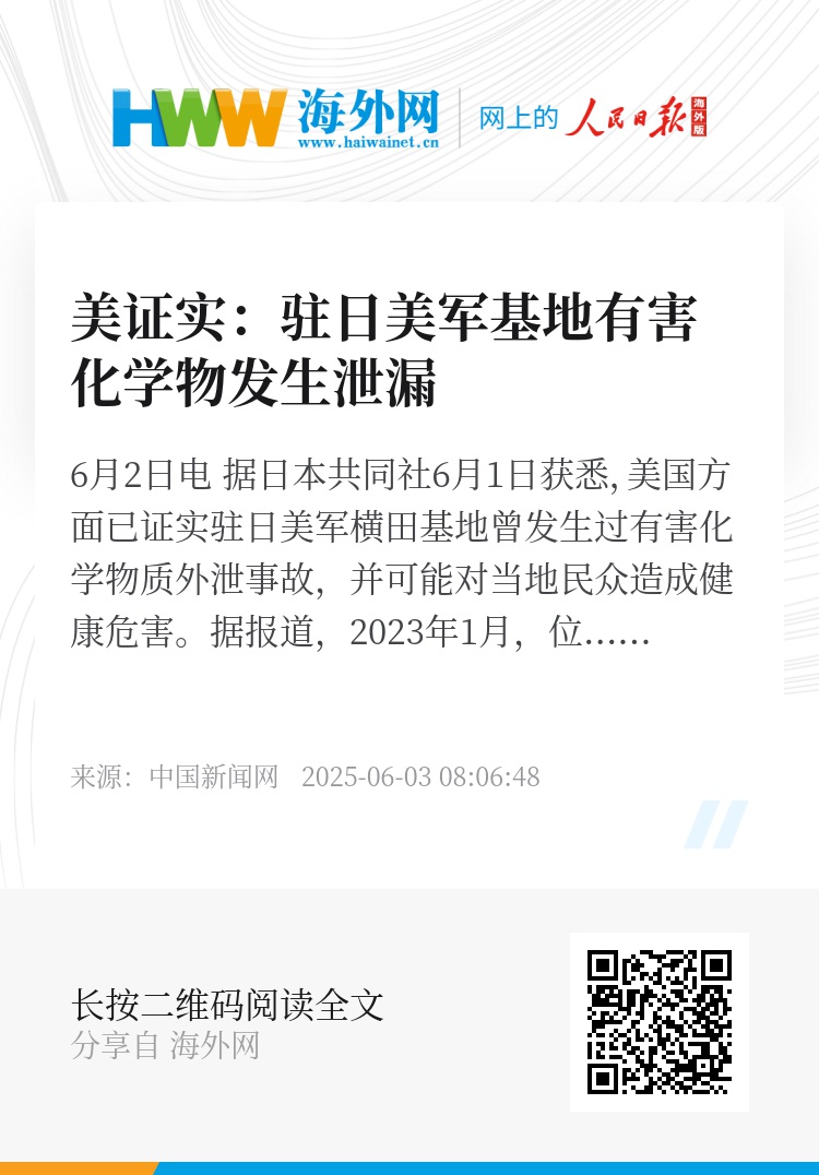 中新网6月2日电 据日本共同社6月1日获悉,美国方面已证实驻日美军横田基地曾发生过有害化学物质外泄事故,并可能对当地民众造成健康危害。