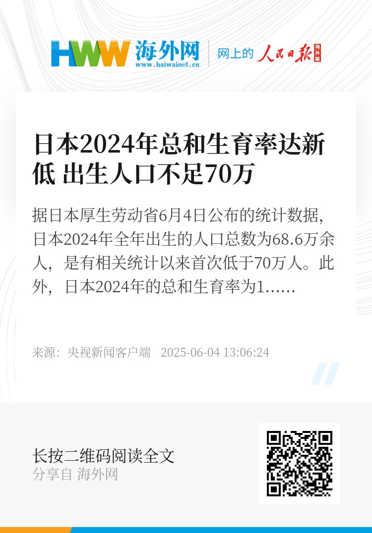 据日本厚生劳动省6月4日公布的统计数据,日本2024年全年出生的人口总数为68.6万余人,是有相关统计以来首次低于70万人。此外,日本2024年的总和生育率为1.15,也是有相关统计以来最低。(总台报道员 柏春洋)