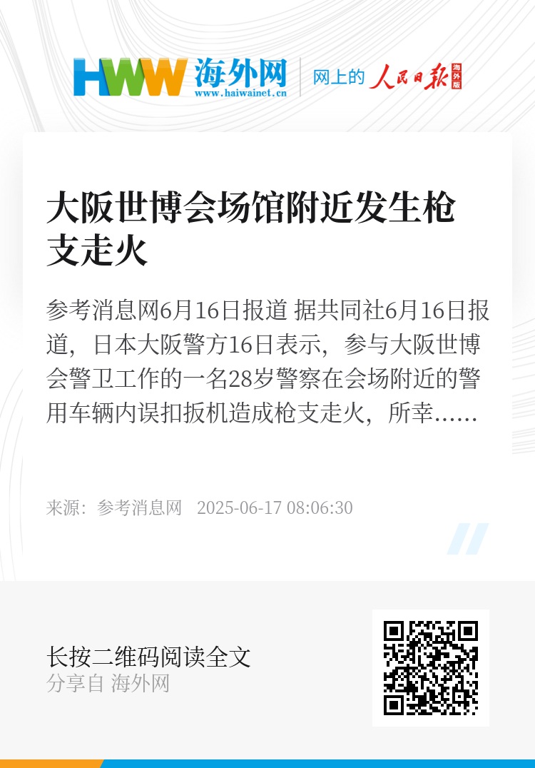 参考消息网6月16日报道 据共同社6月16日报道,日本大阪警方16日表示,参与大阪世博会警卫工作的一名28岁警察在会场附近的警用车辆内误扣扳机造成枪支走火,所幸未造成人员伤亡。