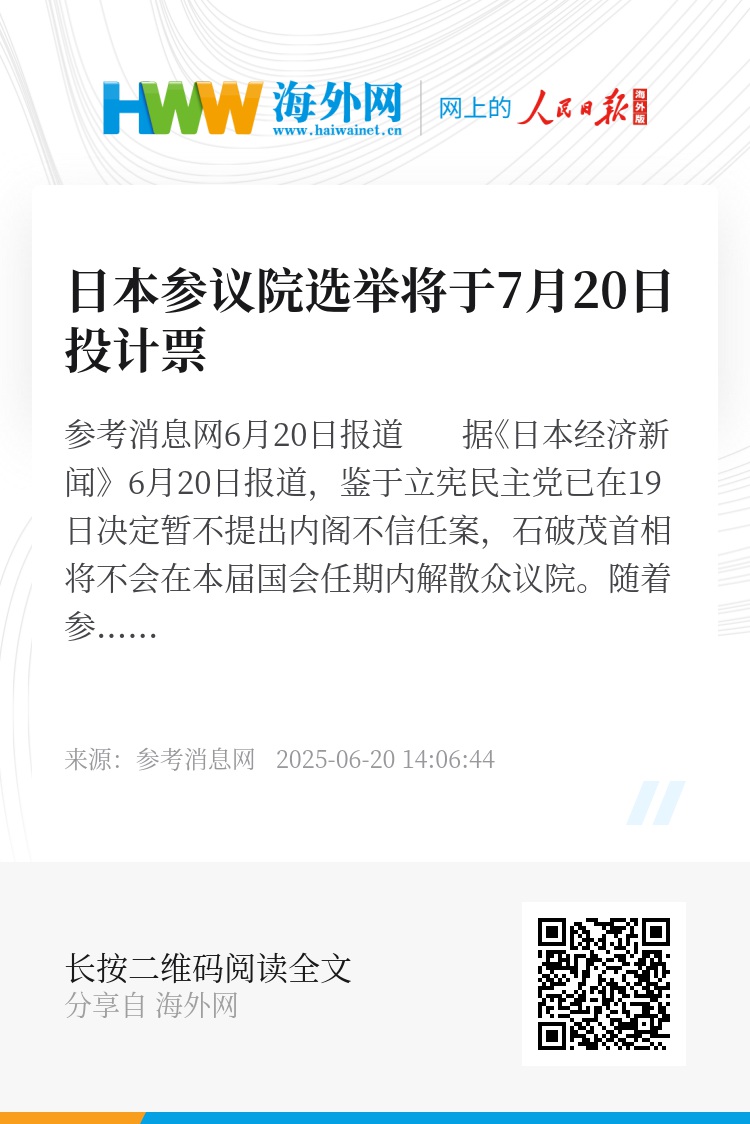 参考消息网6月20日报道 据《日本经济新闻》6月20日报道,鉴于立宪民主党已在19日决定暂不提出内阁不信任案,石破茂首相将不会在本届国会任期内解散众议院。随着参众两院同日选举的可能性消失,今年夏天的参议院选举预计将按照7月3日公示、20日投计票的日程推进。