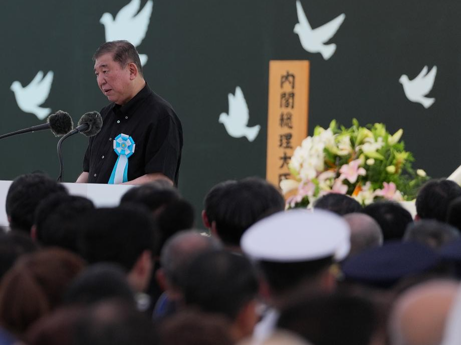6月23日,在日本冲绳,日本首相石破茂在冲绳战殁者追悼仪式上发言。新华社记者 贾浩成 摄