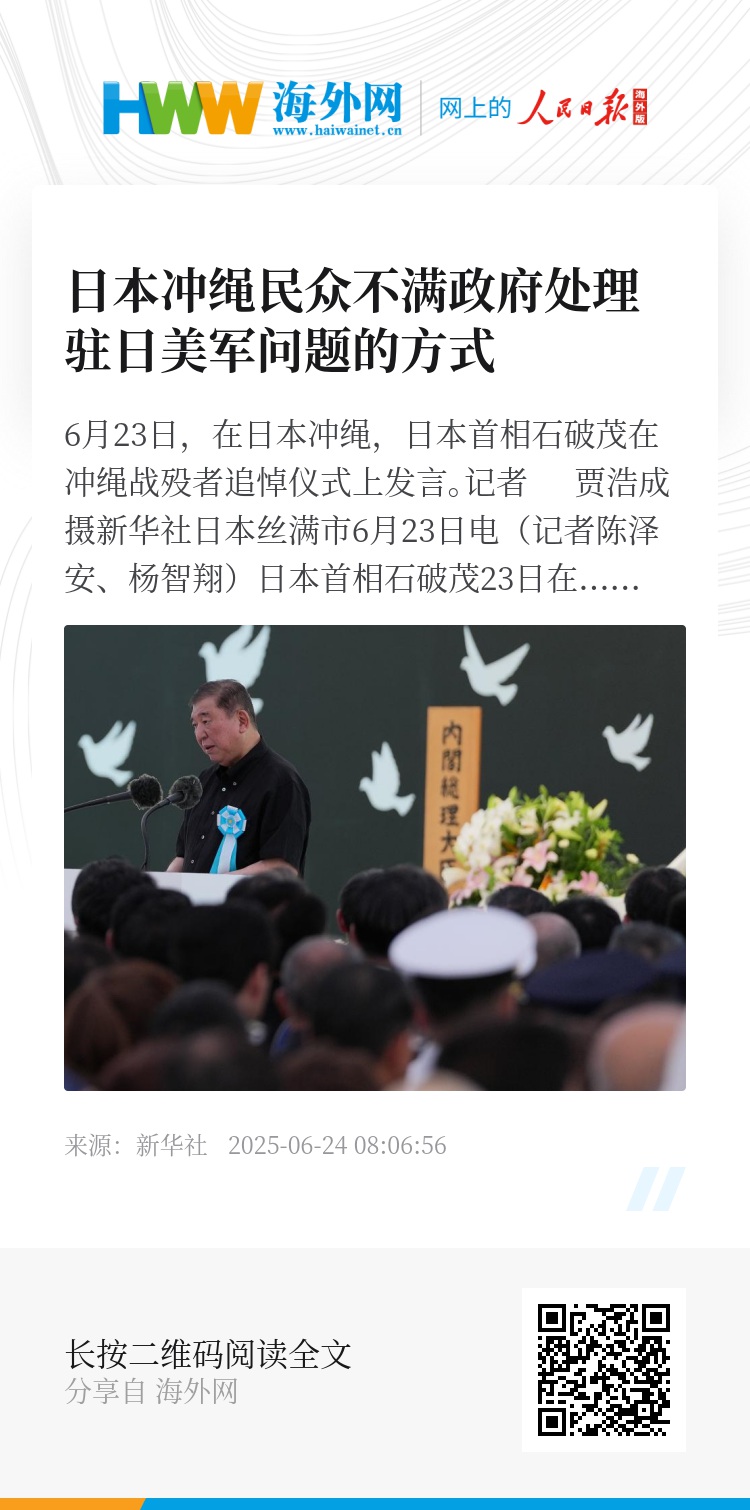 新华社日本丝满市6月23日电(记者陈泽安、杨智翔)日本首相石破茂23日在出席冲绳战殁者追悼仪式时说,他决心减轻冲绳民众因当地美军密集驻扎带来的沉重负担。但当地民众表示,不满日本政府处理驻日美军相关问题的方式。