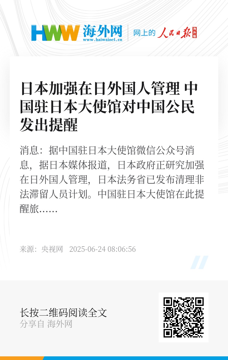 央视网消息:据中国驻日本大使馆微信公众号消息,据日本媒体报道,日本政府正研究加强在日外国人管理,日本法务省已发布清理非法滞留人员计划。中国驻日本大使馆在此提醒旅居日本及计划来日的中国公民及时了解并遵守有关法律法规,避免个人利益受损,请重点关注以下事项: