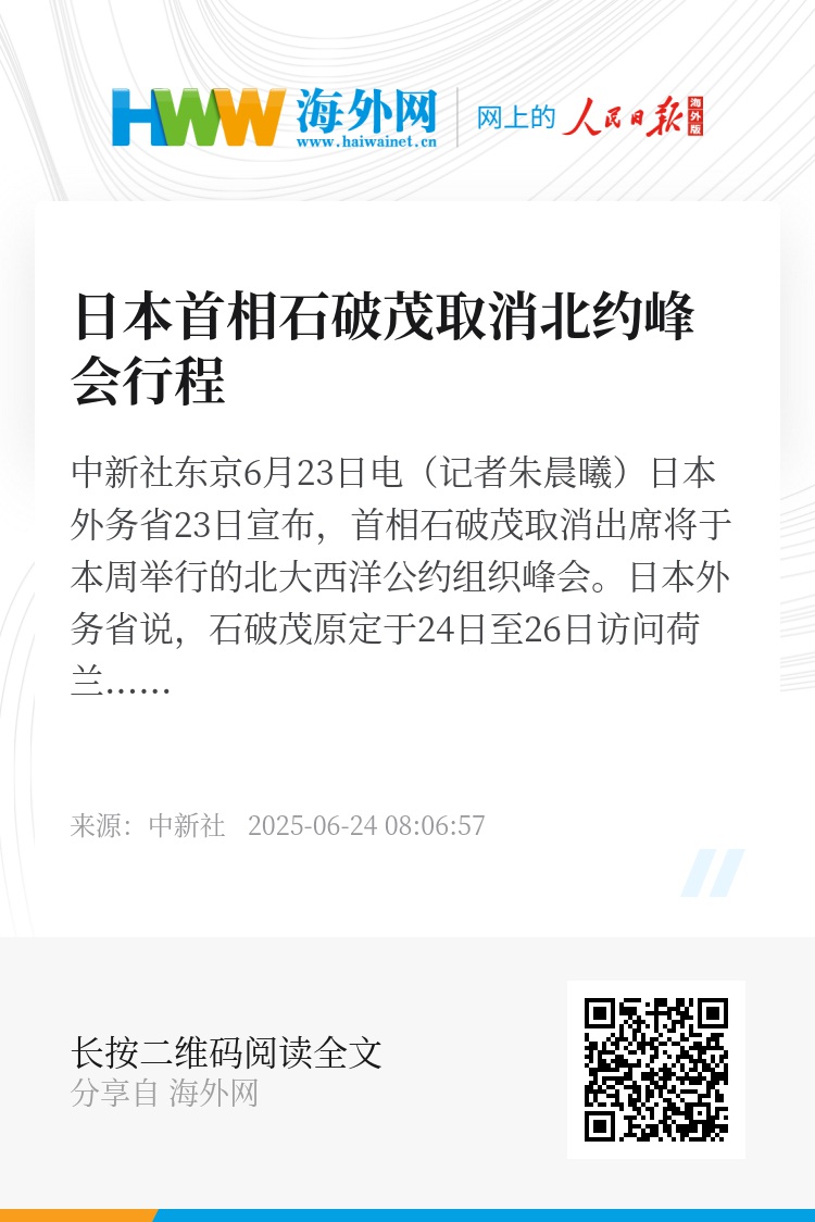 日本外务省说,石破茂原定于24日至26日访问荷兰海牙并出席北约峰会,但因多方面考虑,决定取消行程。