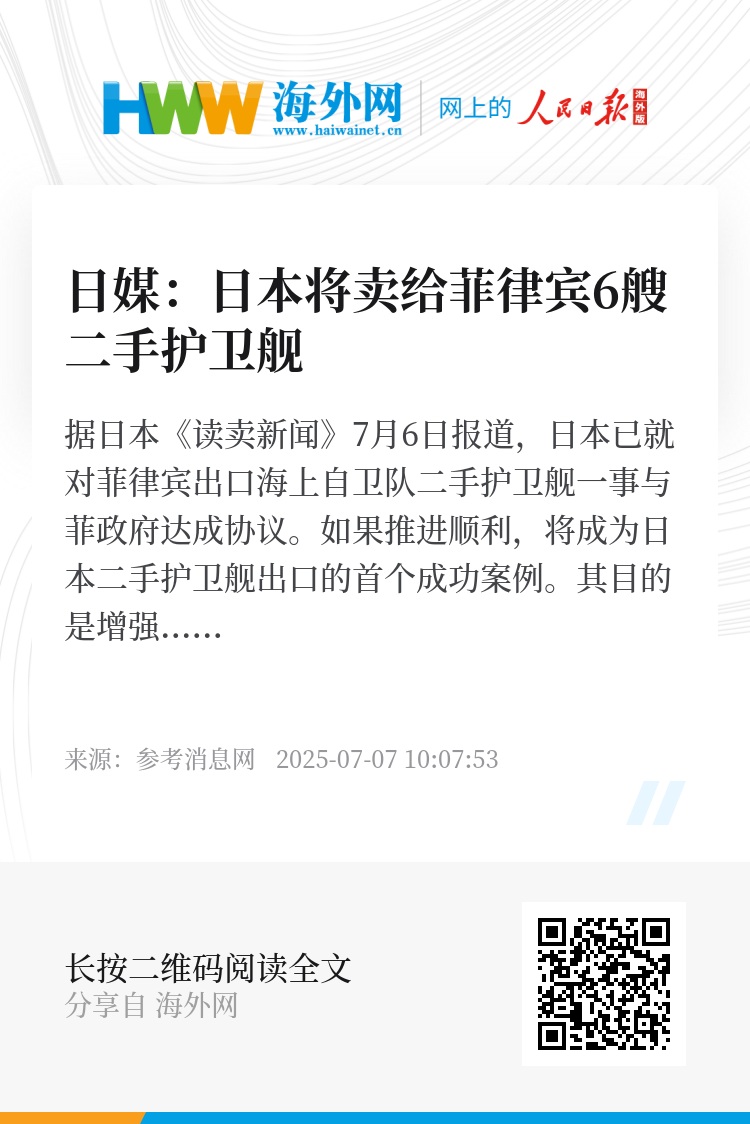 据日本《读卖新闻》7月6日报道,日本已就对菲律宾出口海上自卫队二手护卫舰一事与菲政府达成协议。如果推进顺利,将成为日本二手护卫舰出口的首个成功案例。其目的是增强与菲律宾军方的协同作战能力。