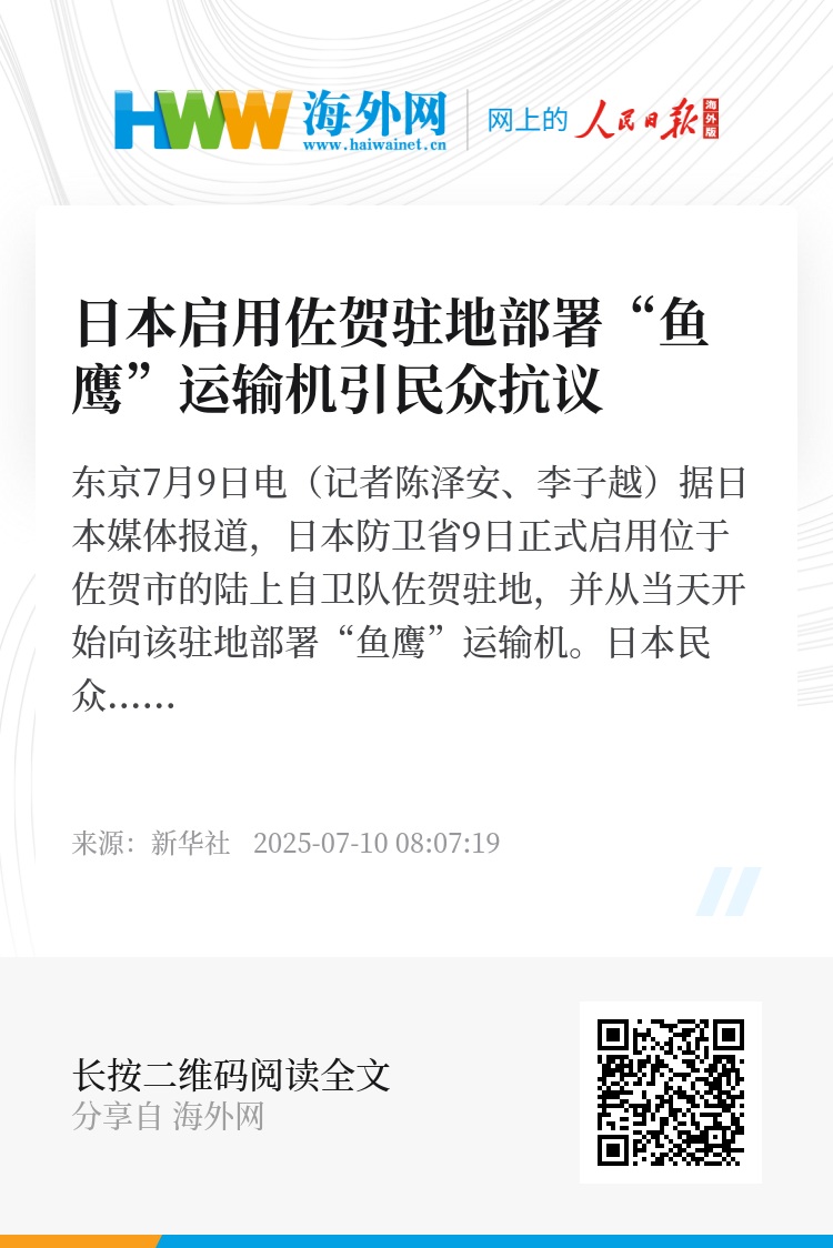 新华社东京7月9日电(记者陈泽安、李子越)据日本媒体报道,日本防卫省9日正式启用位于佐贺市的陆上自卫队佐贺驻地,并从当天开始向该驻地部署“鱼鹰”运输机。日本民众当天在驻地正门前抗议部署“鱼鹰”。