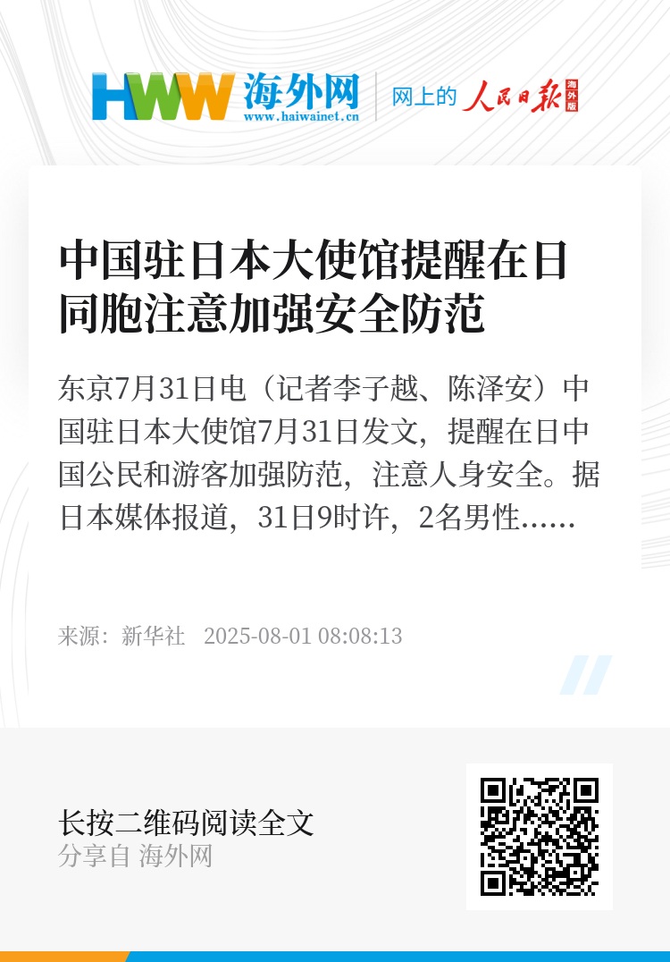 新华社东京7月31日电(记者李子越、陈泽安)中国驻日本大使馆7月31日发文,提醒在日中国公民和游客加强防范,注意人身安全。