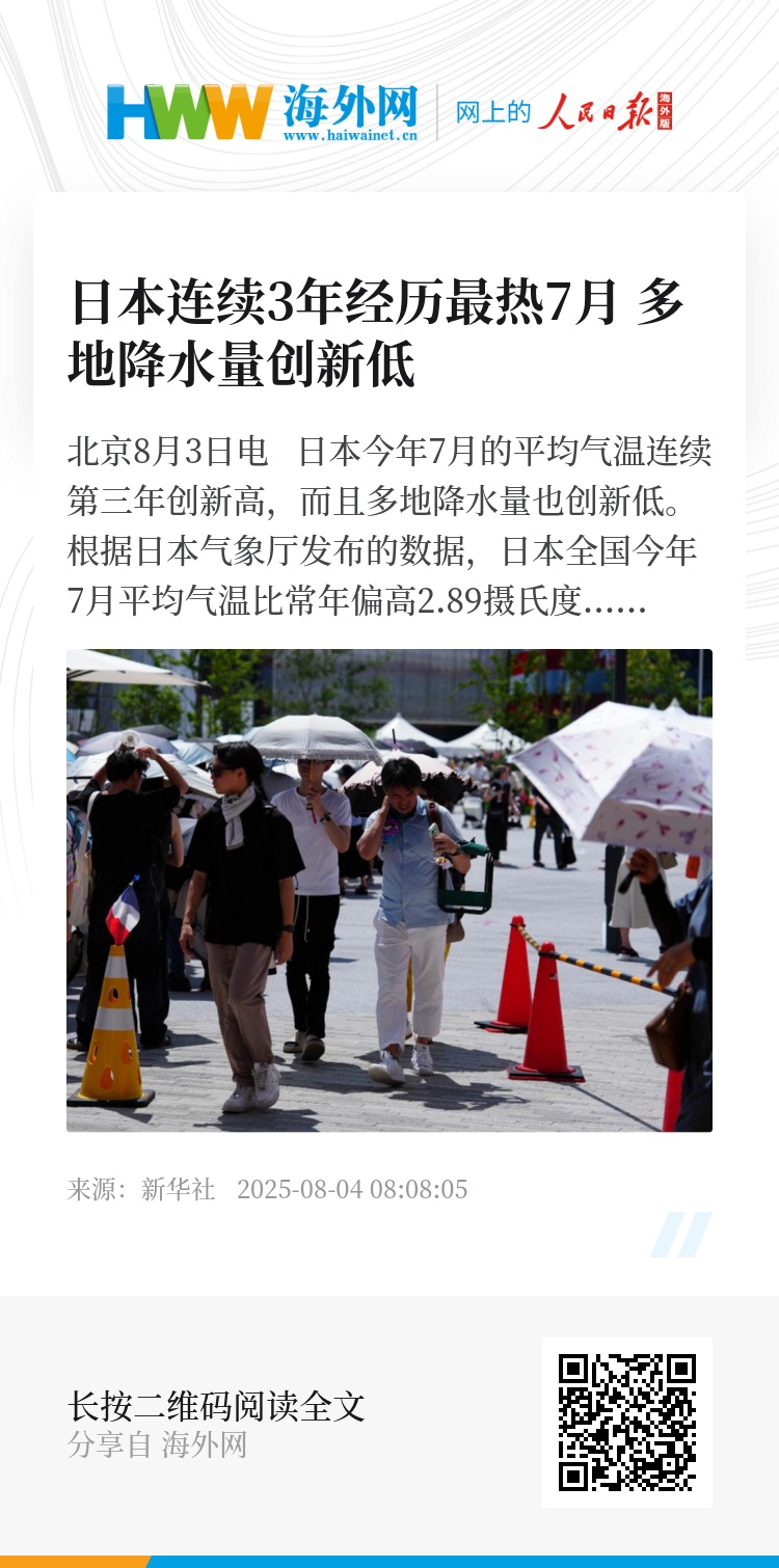 新华社北京8月3日电 日本今年7月的平均气温连续第三年创新高,而且多地降水量也创新低。
