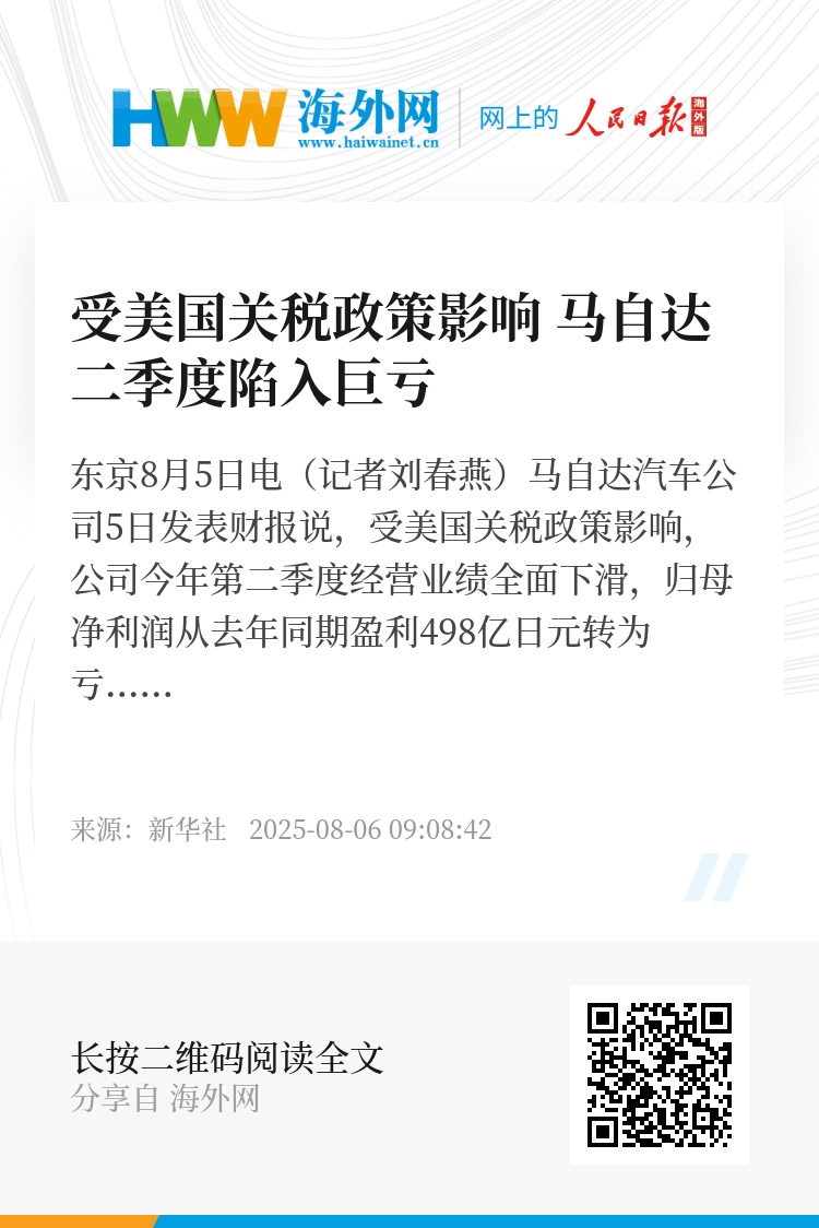 新华社东京8月5日电(记者刘春燕)马自达汽车公司5日发表财报说,受美国关税政策影响,公司今年第二季度经营业绩全面下滑,归母净利润从去年同期盈利498亿日元转为亏损421亿日元(1美元约合147日元)。