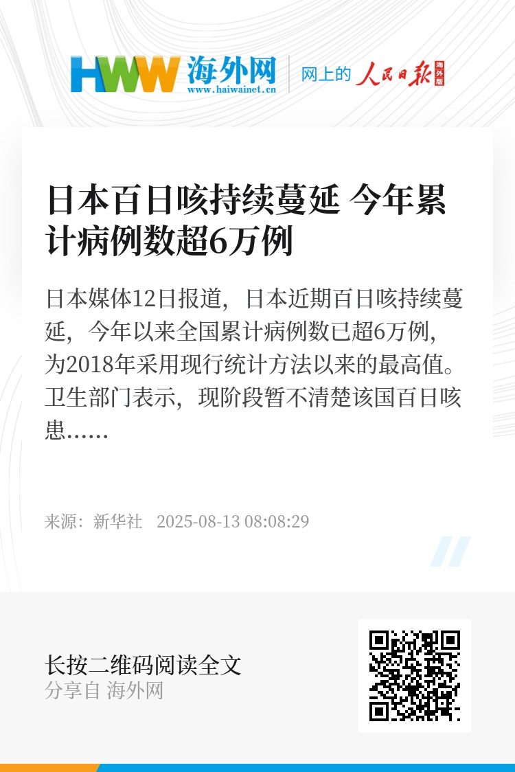 日本媒体12日报道,日本近期百日咳持续蔓延,今年以来全国累计病例数已超6万例,为2018年采用现行统计方法以来的最高值。卫生部门表示,现阶段暂不清楚该国百日咳患者数大幅增加的具体原因。
