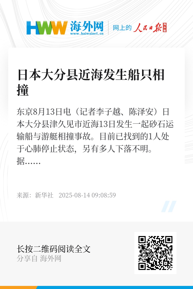 新华社东京8月13日电(记者李子越、陈泽安)日本大分县津久见市近海13日发生一起砂石运输船与游艇相撞事故。目前已找到的1人处于心肺停止状态,另有多人下落不明。