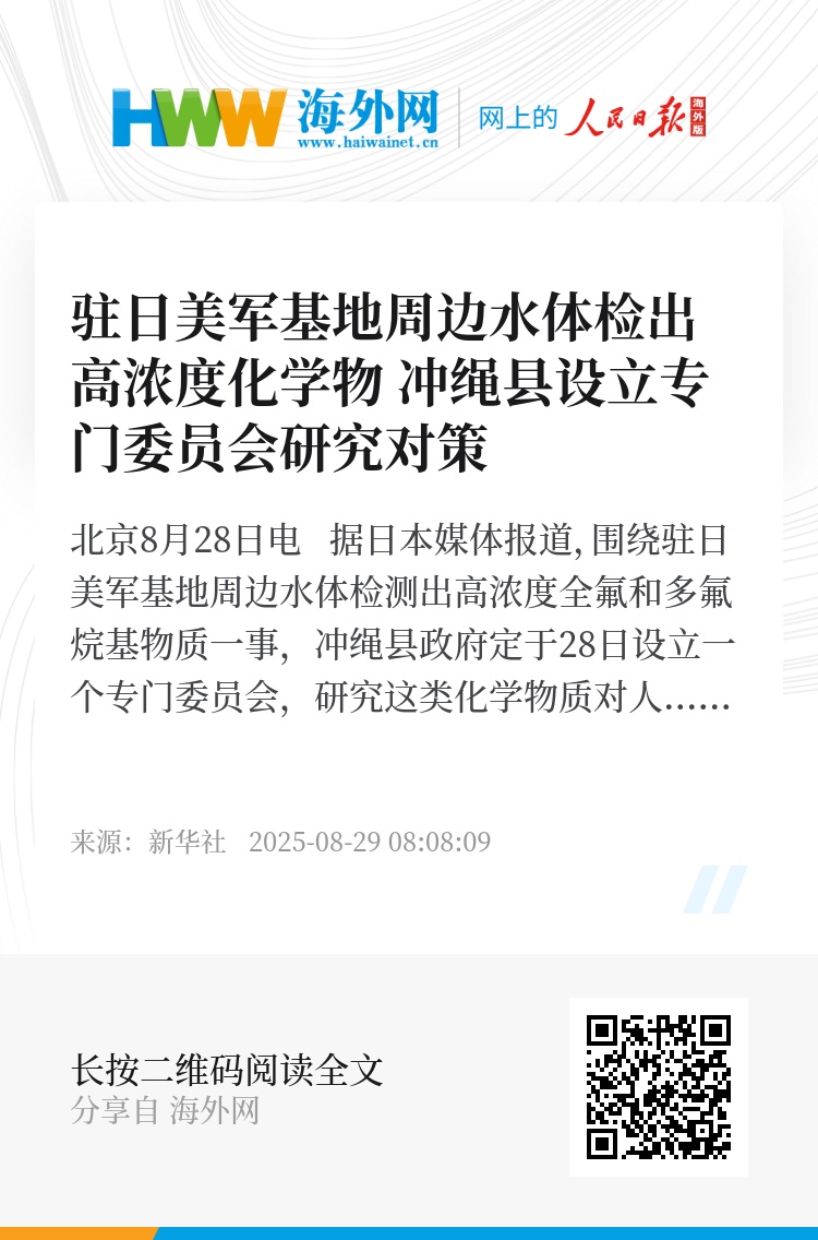 新华社北京8月28日电 据日本媒体报道,围绕驻日美军基地周边水体检测出高浓度全氟和多氟烷基物质一事,冲绳县政府定于28日设立一个专门委员会,研究这类化学物质对人体健康的影响并讨论相关对策。