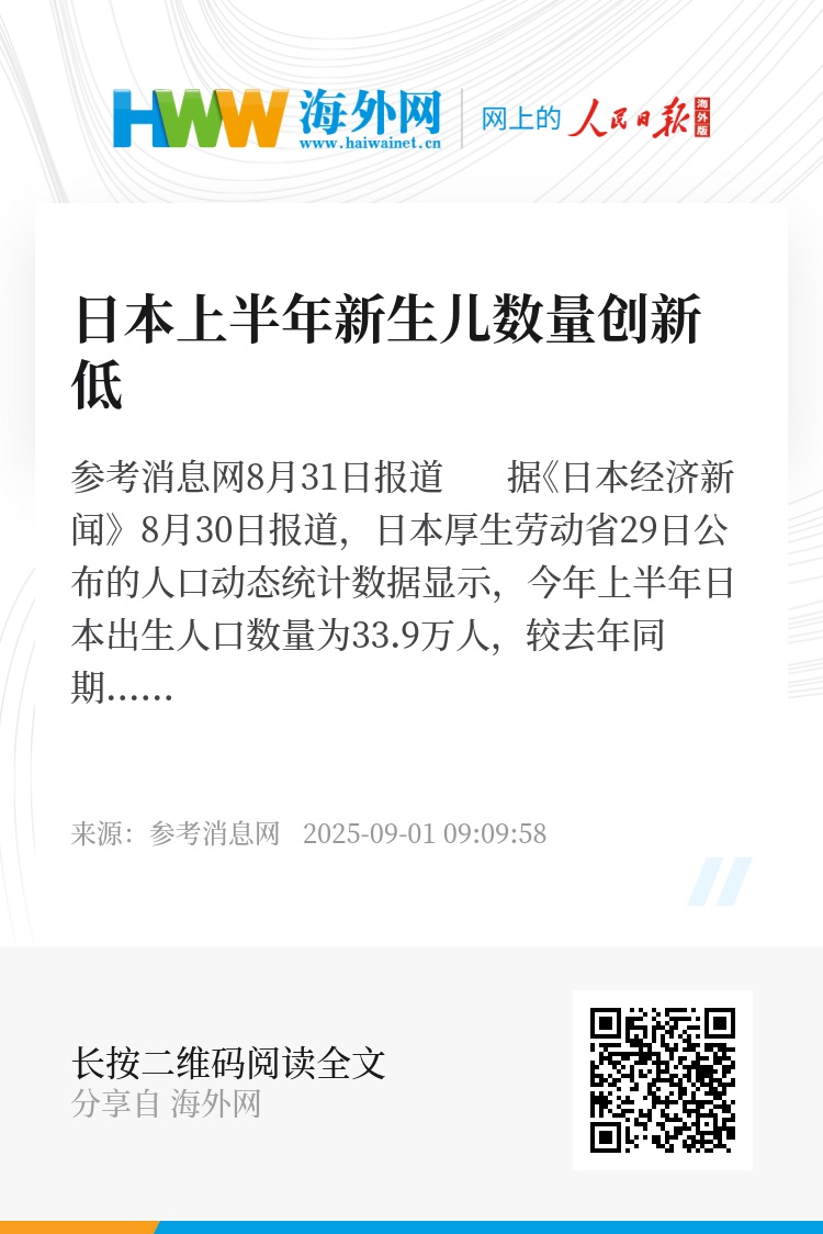 这是自1969年有可比数据以来,日本上半年出生人数的同期最低值。如果按照这一速度发展下去,全年出生人数也很有可能创下历史新低。
