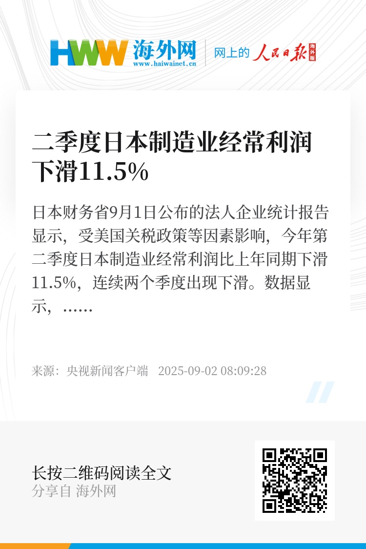 数据显示,二季度日本制造业销售额同比增长1.3%,但受美国关税政策及汇率等因素影响,经常利润同比下降11.5%。