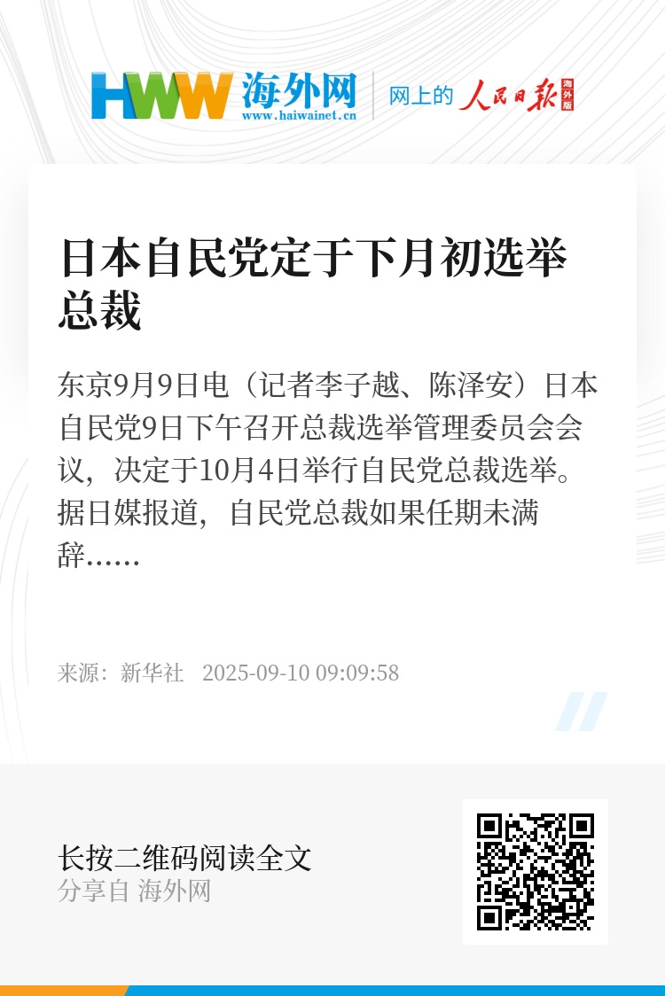 新华社东京9月9日电(记者李子越、陈泽安)日本自民党9日下午召开总裁选举管理委员会会议,决定于10月4日举行自民党总裁选举。
