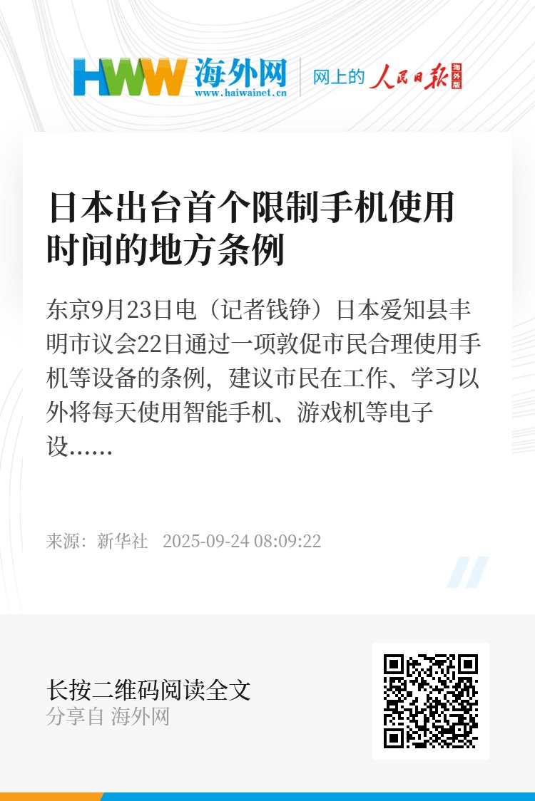 新华社东京9月23日电(记者钱铮)日本爱知县丰明市议会22日通过一项敦促市民合理使用手机等设备的条例,建议市民在工作、学习以外将每天使用智能手机、游戏机等电子设备的时间控制在两小时以内。这是日本首个限制手机等电子设备使用时间的地方条例。