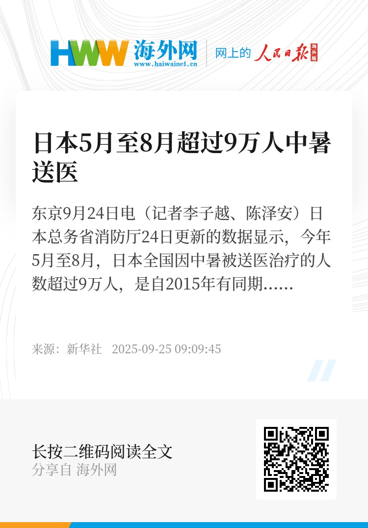 新华社东京9月24日电(记者李子越、陈泽安)日本总务省消防厅24日更新的数据显示,今年5月至8月,日本全国因中暑被送医治疗的人数超过9万人,是自2015年有同期可比数据以来的第二多。
