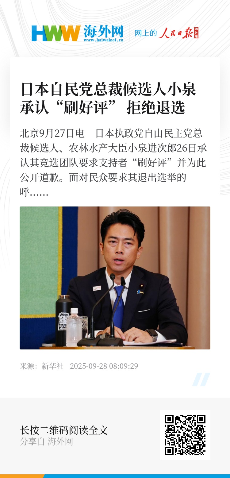 新华社北京9月27日电 日本执政党自由民主党总裁候选人、农林水产大臣小泉进次郎26日承认其竞选团队要求支持者“刷好评”并为此公开道歉。面对民众要求其退出选举的呼声,他表示将继续参选。