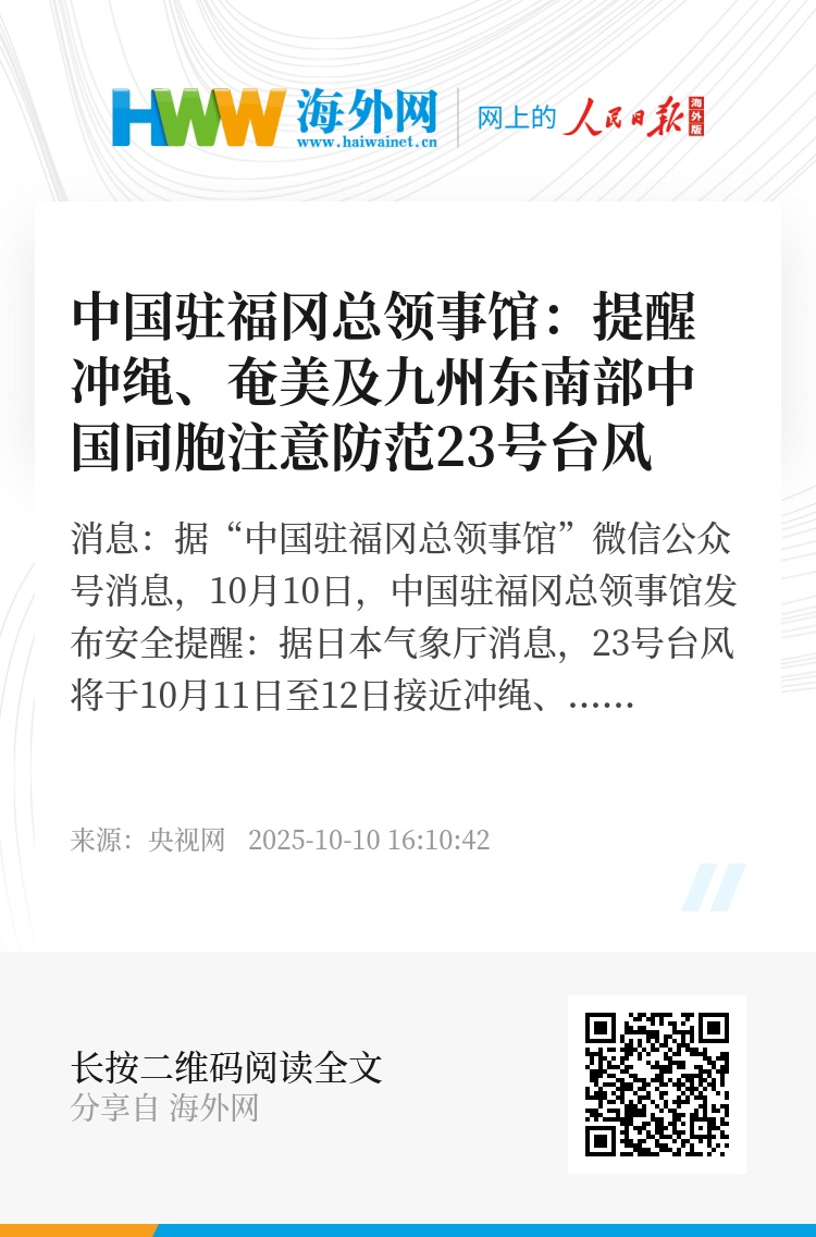 央视网消息:据“中国驻福冈总领事馆”微信公众号消息,10月10日,中国驻福冈总领事馆发布安全提醒:据日本气象厅消息,23号台风将于10月11日至12日接近冲绳、奄美及九州东南部地区,中国驻福冈总领事馆提醒上述地区中国同胞密切关注灾害预警和防灾信息,远离河边、海边及地势较低区域,做好防灾、应急避难等准备,确保人身安全。请11日至12日计划赴上述地区的中国游客密切关注天气信息及航空、铁路、公路运行情况,及时调整或取消出行计划,避免在恶劣天气出行。