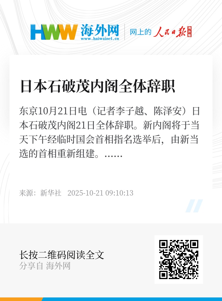 新华社东京10月21日电(记者李子越、陈泽安)日本石破茂内阁21日全体辞职。新内阁将于当天下午经临时国会首相指名选举后,由新当选的首相重新组建。